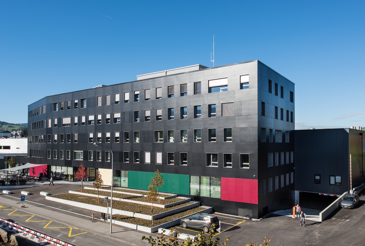 Constructivement, l’ouvrage repose sur une structure de dalles en béton, avec un noyau central porteur, incluant les circulations verti-cales. Une série de piliers béton et la façade elle-même complètent le système porteur. L’enveloppe se compose d’une façade venti-lée, isolation polystyrène, revêtement stratifié compact, de type Fundermax et de fenêtres en PVC-ALU, en triple vitrages.